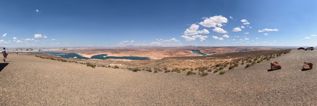 Onze magen begonnen te knorren en via de plaatselijke Walmart zijn we naar Wahweap Overlook gereden. Een uitzichtpunt met een prachtig 360° panorama van Lake Powell, Wahweap Marina, de Glen Canyon Dam, Navajo Generating Station, plus uitzicht over Navajo Mountain, Tower Butte en Sentinel Rock. Hier hebben we dan ook heerlijk geluncht.
