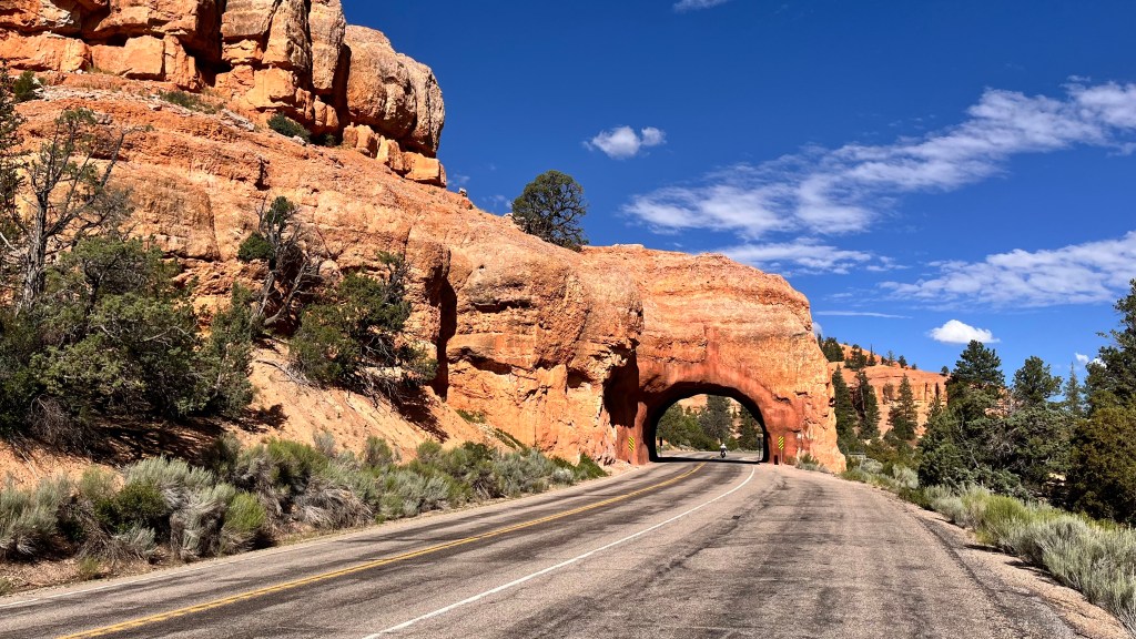 Na de lunch in gestrekte draf richting Bryce Canyon. Vlak voor Bryce draai je Highway 12 op. Ook wel bekend als Utah Scenic Byway 12. Eén van de mooiste wegen van USA. We hebben hier (helaas) alleen het deel tot aan Bryce Canyon gereden, maar de rest is ook prachtig. Vlak voor Bryce kom je door Red Canyon met prachtige rode rotsen en tunnels door de rotsen heen. Zeker stoppen voor een foto!