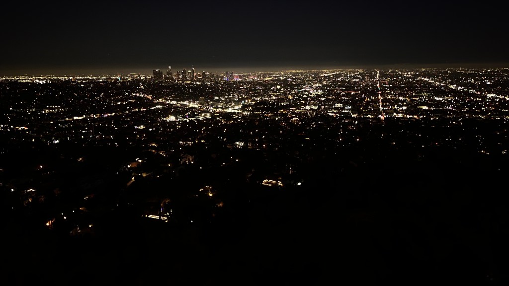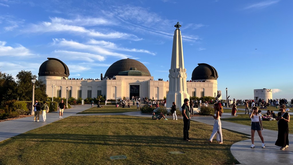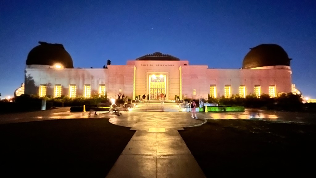 Vanavond richting Griffith Observatory, een sterrenwacht en wetenschappelijk centrum (denk maar aan Big Bang Theory). Het was een beetje druk op de weg ernaartoe. File rijden de berg op en hopen op een parkeerplek. Het was zo druk dat we op het punt stonden om om te draaien. Maar plotseling zag ik een vrije plek op een parkeerplaats. Alleen hoe kom ik daar? Overal pillonnen op de weg. Ik dacht: No you have, yes you can get. Ik vraag het gewoon. En ja hoor, de bewaking kwam eraan, haalde de pillonnen weg en ik werd door het verkeer heen naar de parkeerplaats geloodst. Zelfs de vrouw waar ik moest betalen zei dat ze “a little bit impressed” was. Maar het was allemaal de moeite waard. We hebben weer genoten van een prachtige zonsondergang.